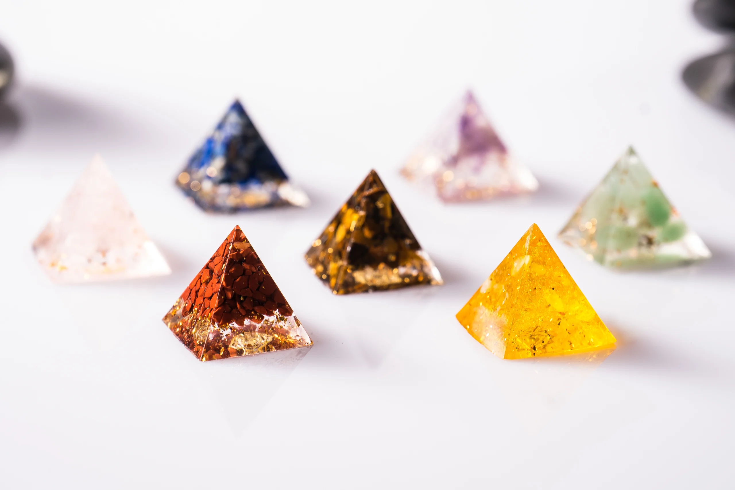 Set sedmih mini piramid, ki predstavljajo vsako izmed sedmih glavnih čaker. Idealno za meditacijo, reiki in energijsko ravnovesje. Te piramide pomagajo uskladiti in uravnovesiti energijo telesa, uma in duha. Velikost vsake piramide: 2 × 2 cm.