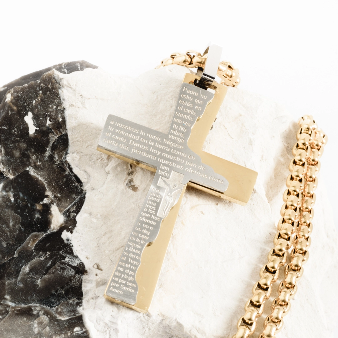 Ta prefinjen obesek križa v zlati barvi, dolžine 3,5 cm, je že opremljen z latinsko gravuro, ki dodaja globlji pomen in osebno noto. Idealno za tiste, ki cenijo klasično lepoto in želijo nositi simbol vere z edinstvenim dotikom.