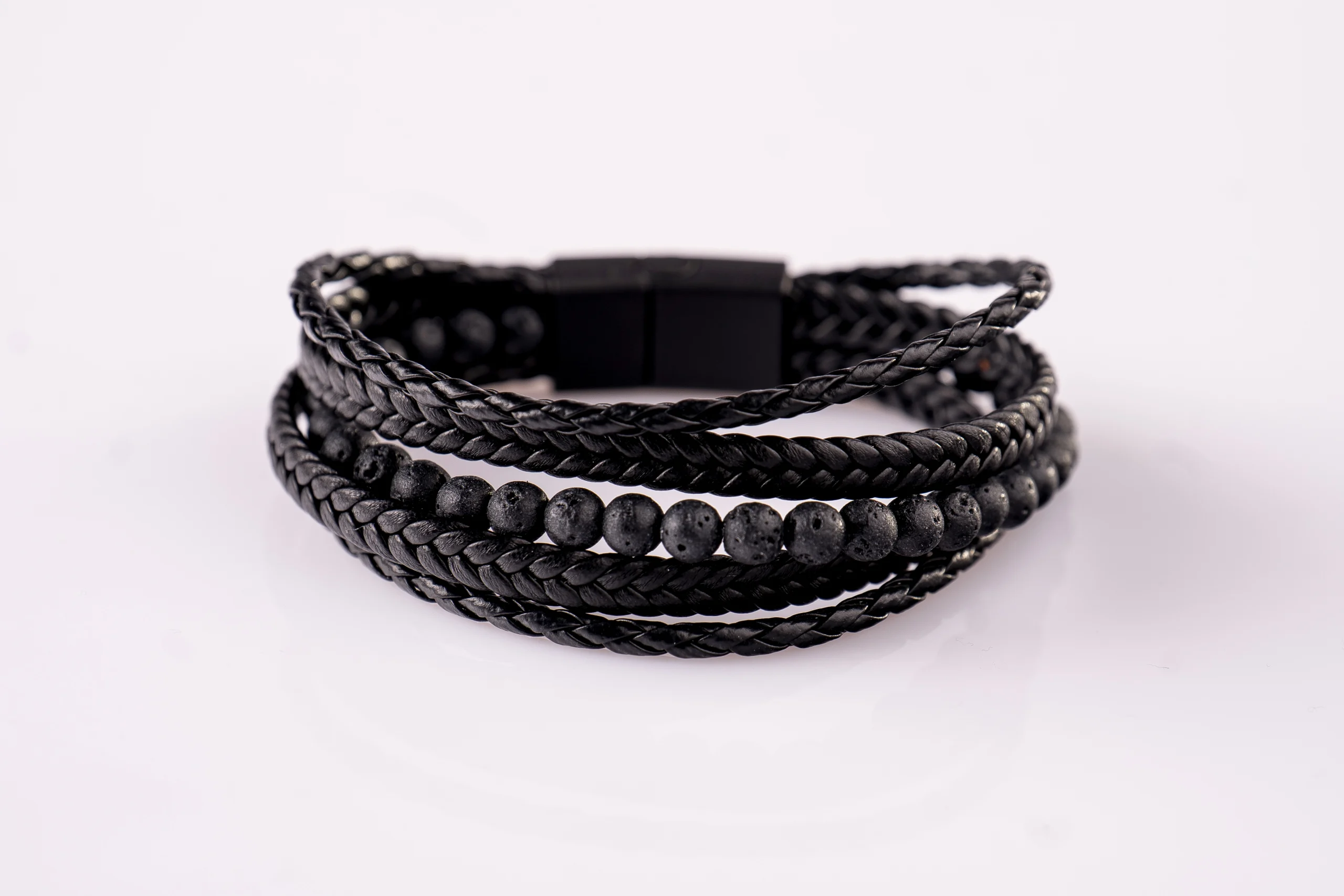 Elegantna kombinacija pletenega usnja in črnih lava kamnov.