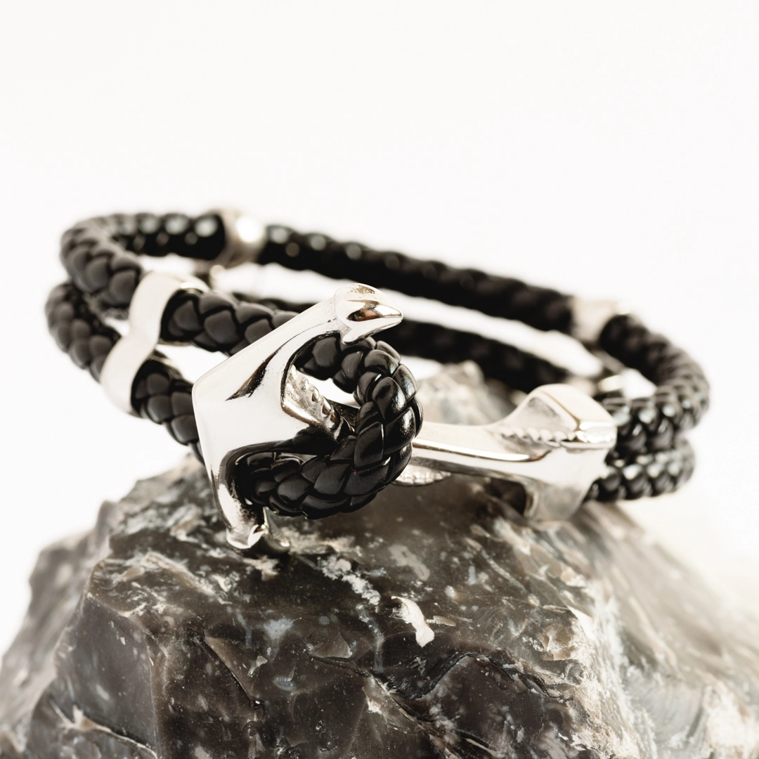 Ta zapestnica združuje trpežnost in eleganco. Sidro iz nerjavečega jekla, simbol moči in stabilnosti, je povezano z dvema usnjenima trakovoma, ki dodata pridih mehkobe in sofisticiranosti.