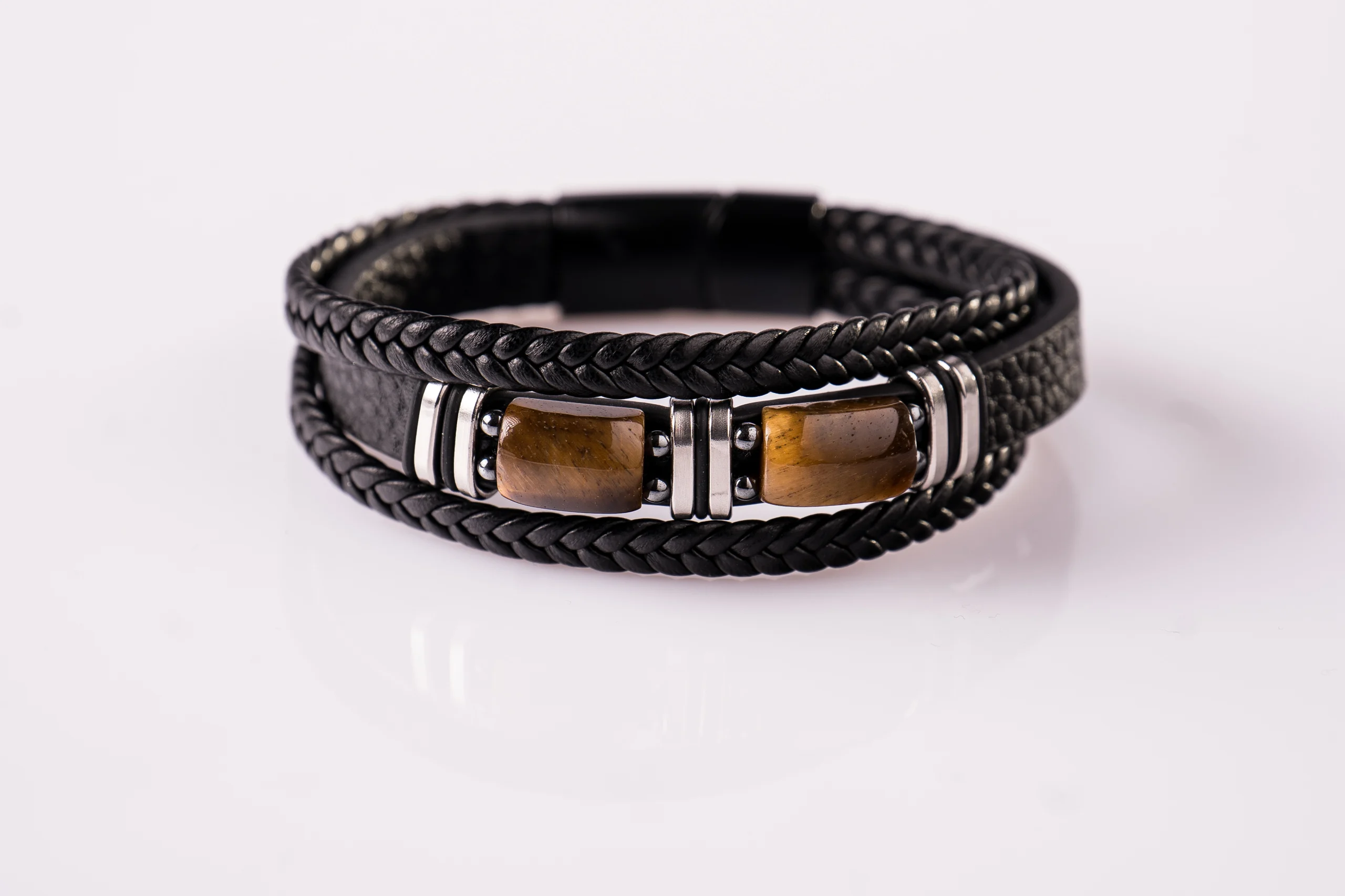 Moč in zaščita v enem kosu. Kamni tigrovega očesa, usnje in nerjaveče jeklo ustvarjajo trden, a eleganten dizajn. Dolžina zapestnice: 21,5 cm.